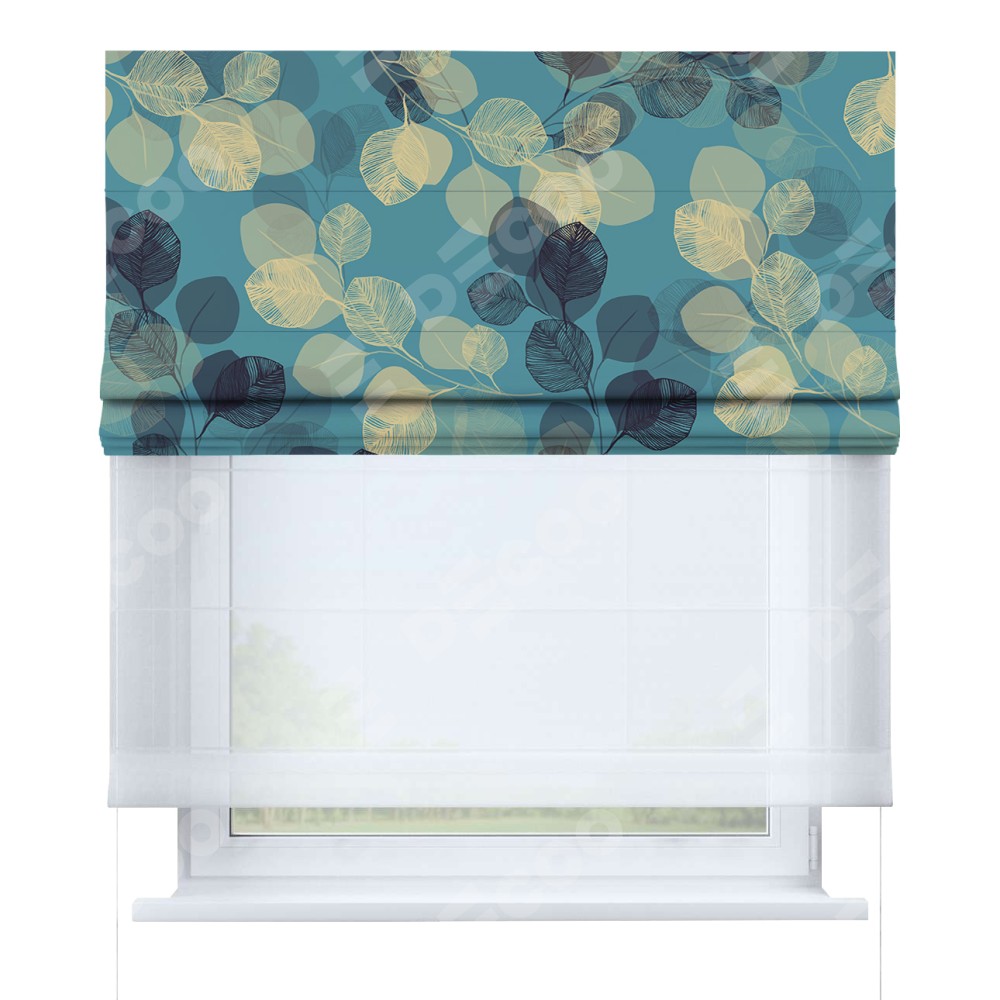 Римская штора день-ночь производителя «Cortin», используется для проёма, пошита из двух полотен, с лицевой блэкаут с нанесением сублимационной печати «Листья в небе», вторая ткань тюль (по стандарту комплектуется тюль белого цвета артикул V-01). Имеет универсальный механизм и подходит для монтажа: на потолок, на стену и в нишу.