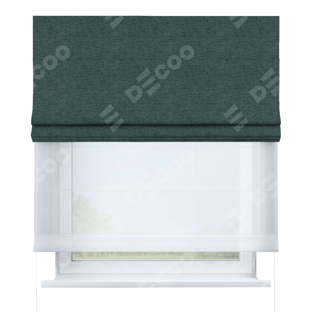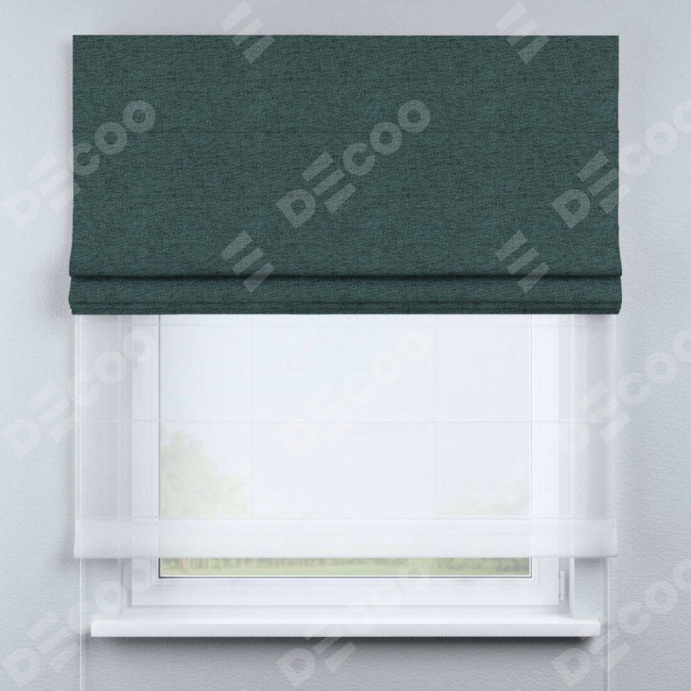 Римская штора день-ночь производителя «Cortin», используется для проёма, пошита из двух полотен, с лицевой стороны стиф димаут сине-зелёный артикул 18194, вторая ткань тюль (по стандарту комплектуется тюль белого цвета артикул V-01). Имеет универсальный механизм и подходит для монтажа: на потолок, на стену и в нишу.