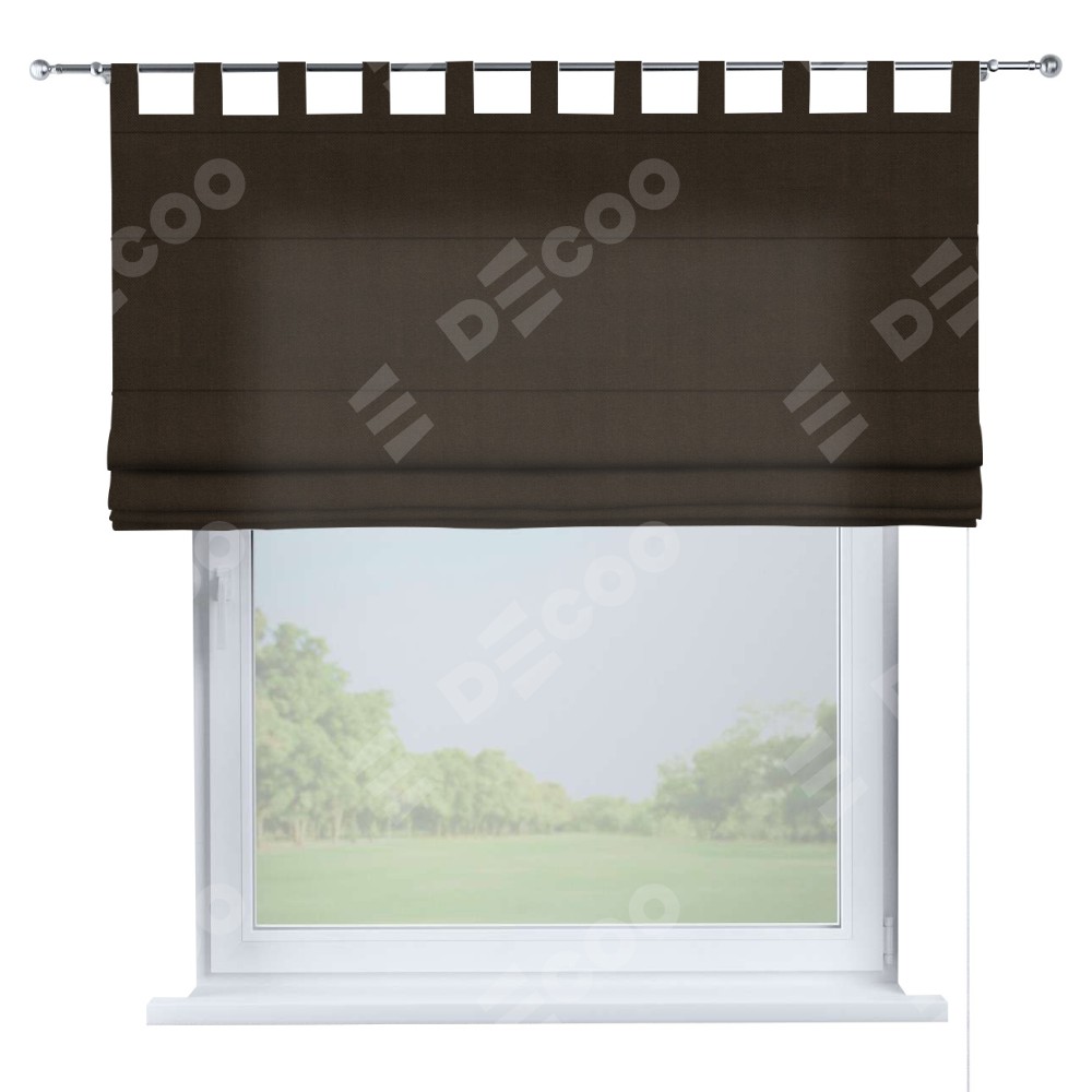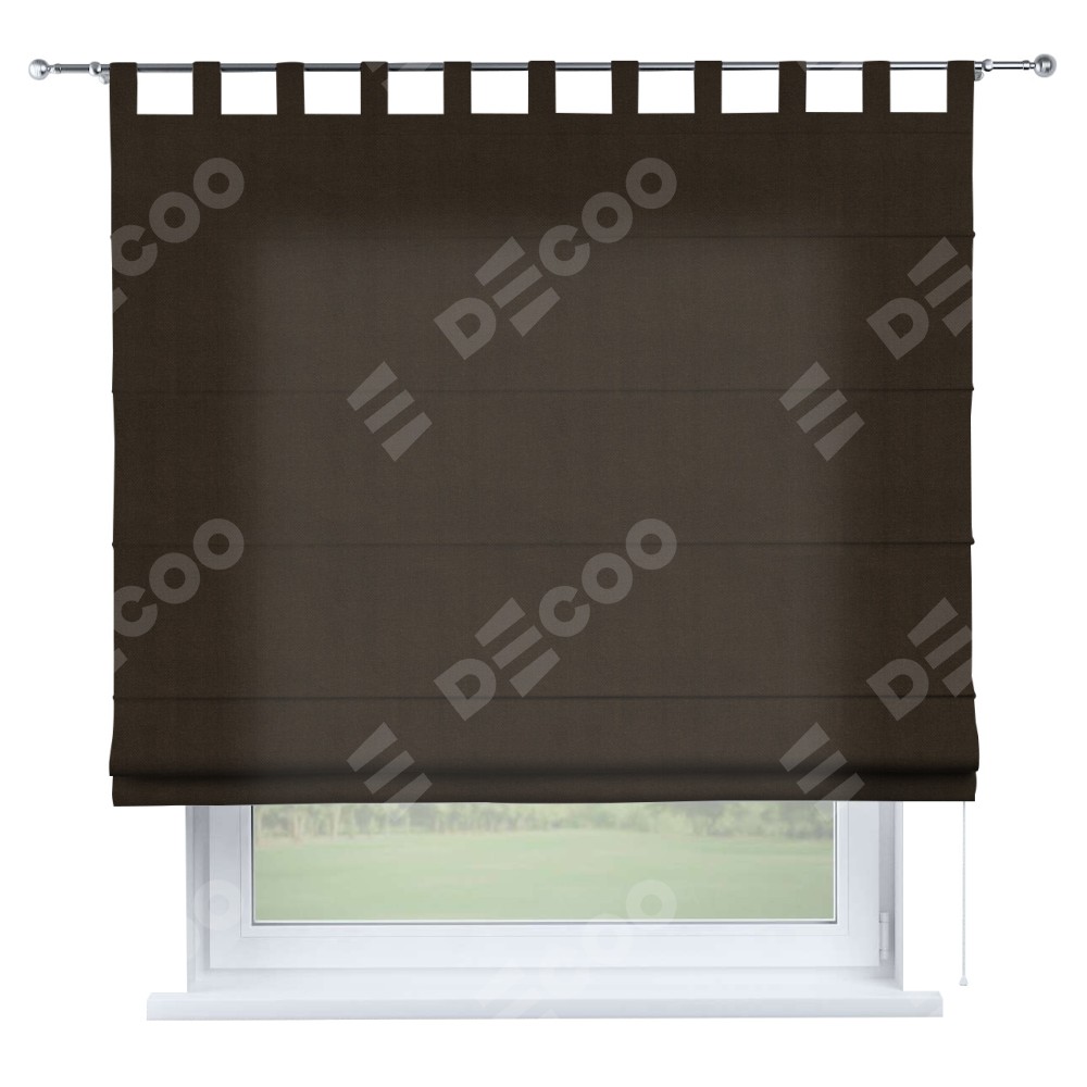 Римская штора производителя «Cortin», используется для проёма, пошита из ткани вельвет тёмно-коричневый, артикул ткани 30991. Данная модель пошита на петлях, комплектуется на выбор круглым карнизом и подходит для монтажа на стену. Римская штора на петлях имеет простую систему регулировки высоты, отличительным преимуществом данной модели является простой способ монтажа. Достаточно повесить ее на трубу и штора готова!