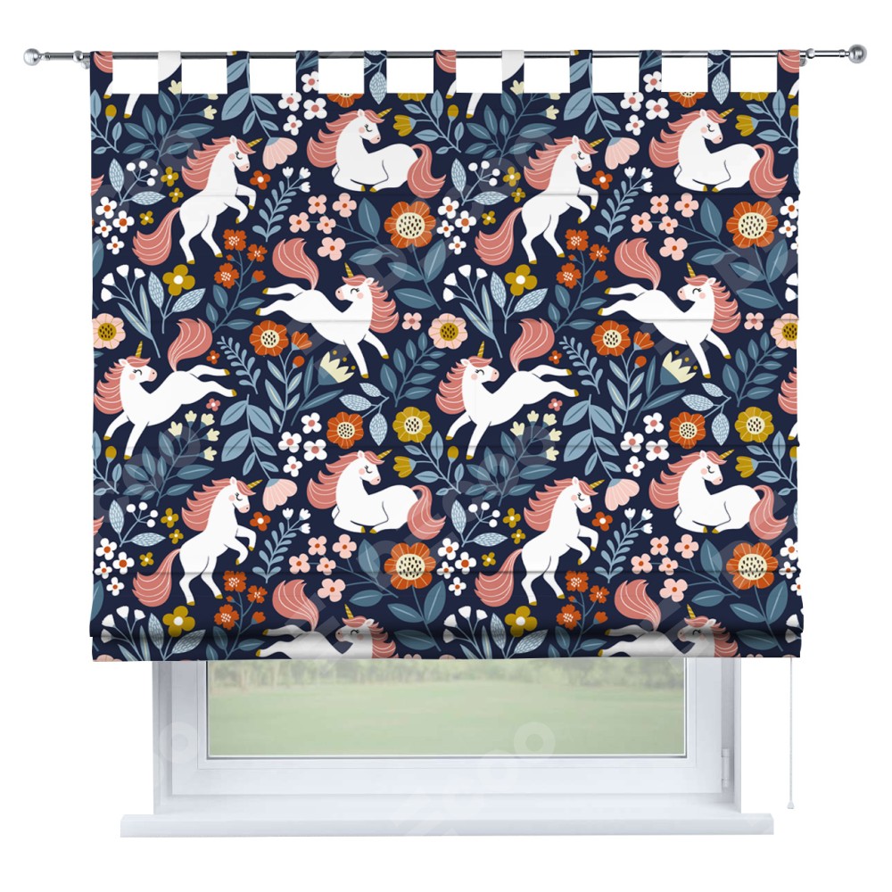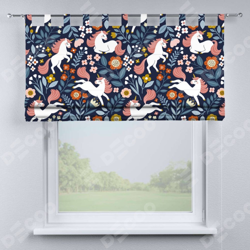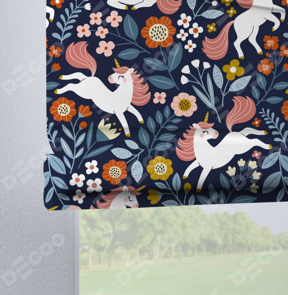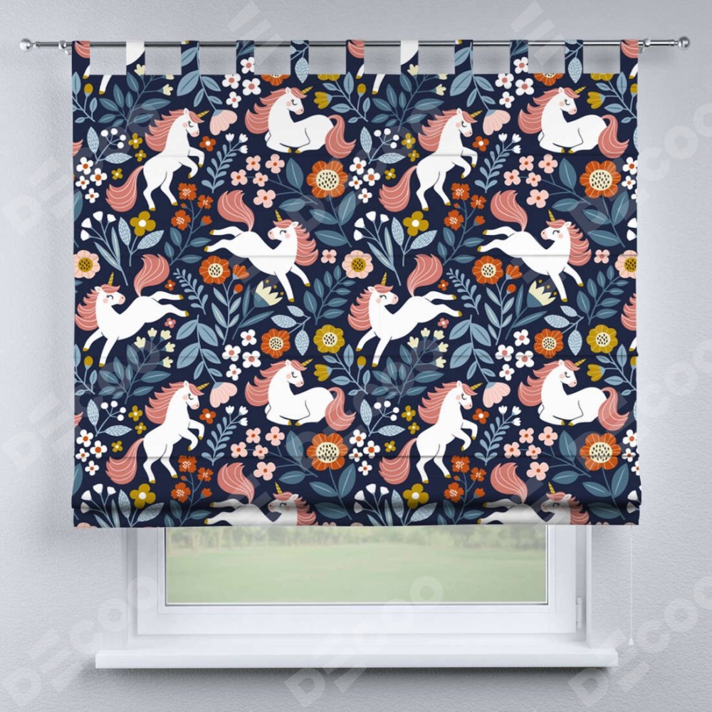 Римская штора производителя «Cortin», используется для проёма, пошита из ткани блэкаут с нанесением сублимационной печати «Цветы и единороги». Данная модель пошита на петлях, комплектуется на выбор круглым карнизом и подходит для монтажа на стену. Римская штора на петлях имеет простую систему регулировки высоты, отличительным преимуществом данной модели является простой способ монтажа. Достаточно повесить ее на трубу и штора готова!