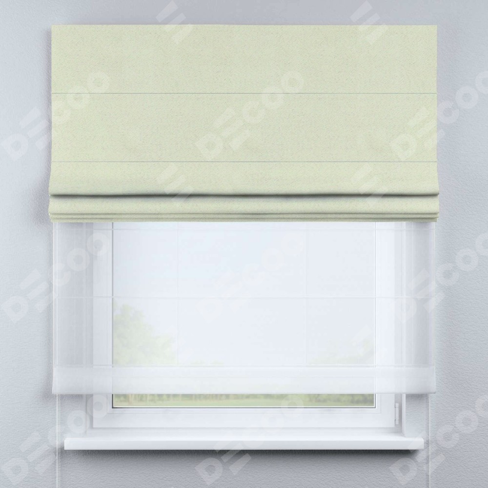Римская штора день-ночь производителя «Cortin», используется для проёма, пошита из двух полотен, с лицевой стороны блэкаут однотонный сливочный артикул 6668−02, вторая ткань тюль (по стандарту комплектуется тюль белого цвета артикул V-01). Имеет универсальный механизм и подходит для монтажа: на потолок, на стену и в нишу.