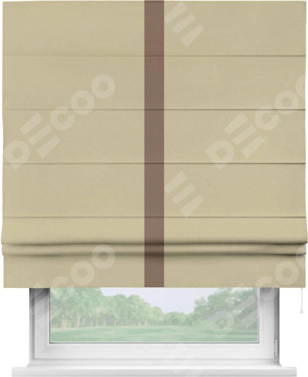 Римская штора производителя «Cortin», используется для проёма, пошита из ткани блэкаут однотонный кофейный, артикул ткани 13130. Отделка шторы кантом «Хайвей», ткань для канта используется из блэкаута однотонного разной расцветки на выбор. Имеет универсальный механизм и подходит для монтажа: на потолок, на стену и в нишу.