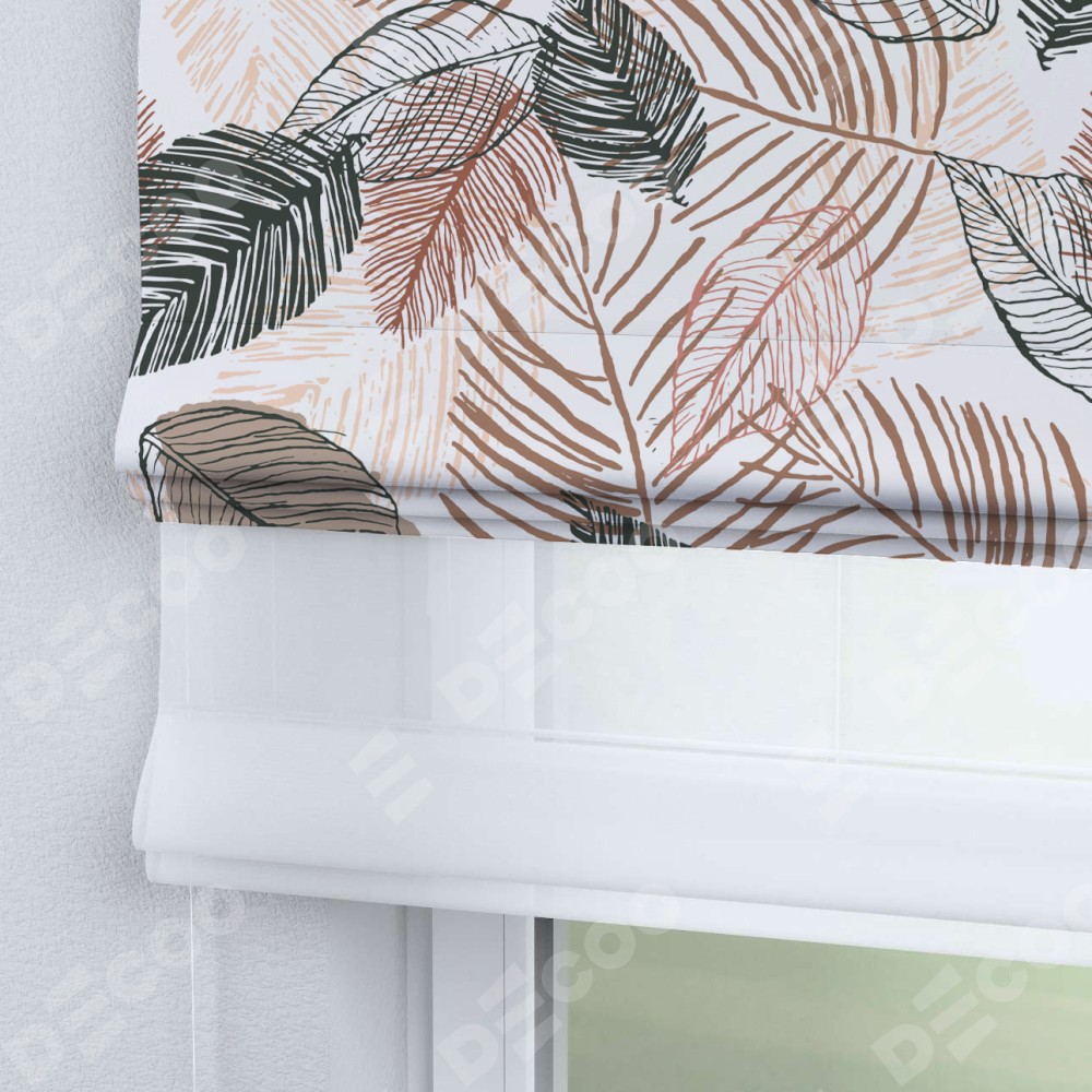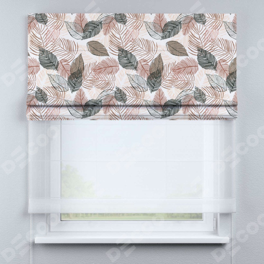 Римская штора день-ночь производителя «Cortin», используется для проёма, пошита из двух полотен, с лицевой блэкаут с нанесением сублимационной печати «Осенний лес», вторая ткань тюль (по стандарту комплектуется тюль белого цвета артикул V-01). Имеет универсальный механизм и подходит для монтажа: на потолок, на стену и в нишу.