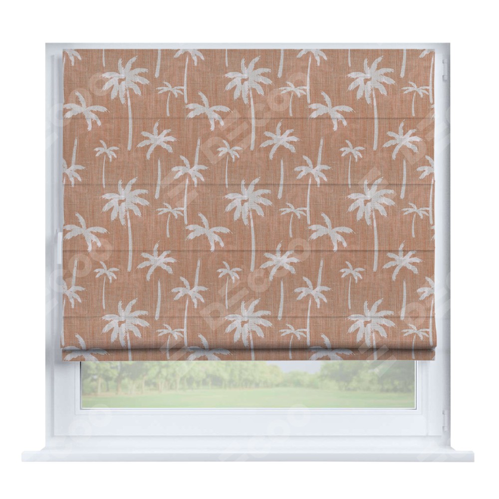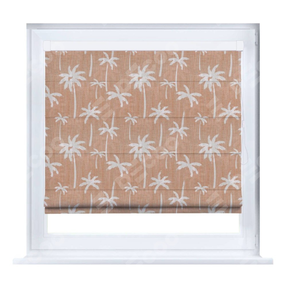 Римская штора производителя «Cortin», устанавливается на створку окна, пошита из ткани блэкаут с нанесением сублимационной печати «Пальмы на закате». Штора шьётся по индивидуальным размерам, для данного типа римской шторы возможная ширина от 35 до 150 см., высота до 250 см.