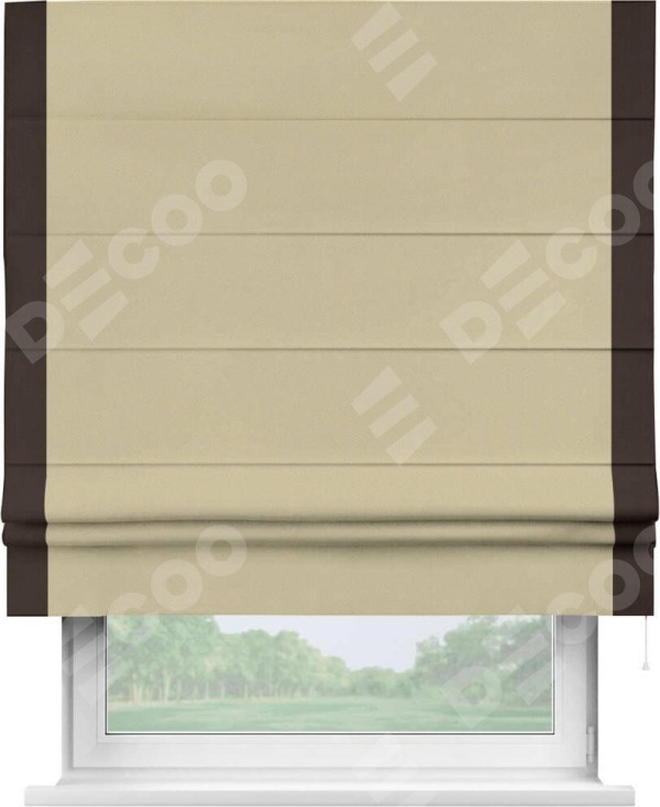 Римская штора производителя «Cortin», используется для проёма, пошита из ткани блэкаут однотонный кофейный, артикул ткани 13130. Отделка шторы кантом «Стрим Дуо», ткань для канта используется из блэкаута однотонного разной расцветки на выбор. Имеет универсальный механизм и подходит для монтажа: на потолок, на стену и в нишу.