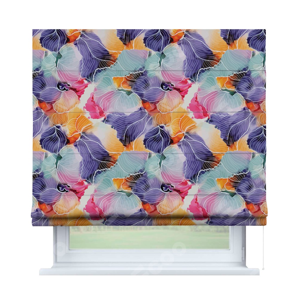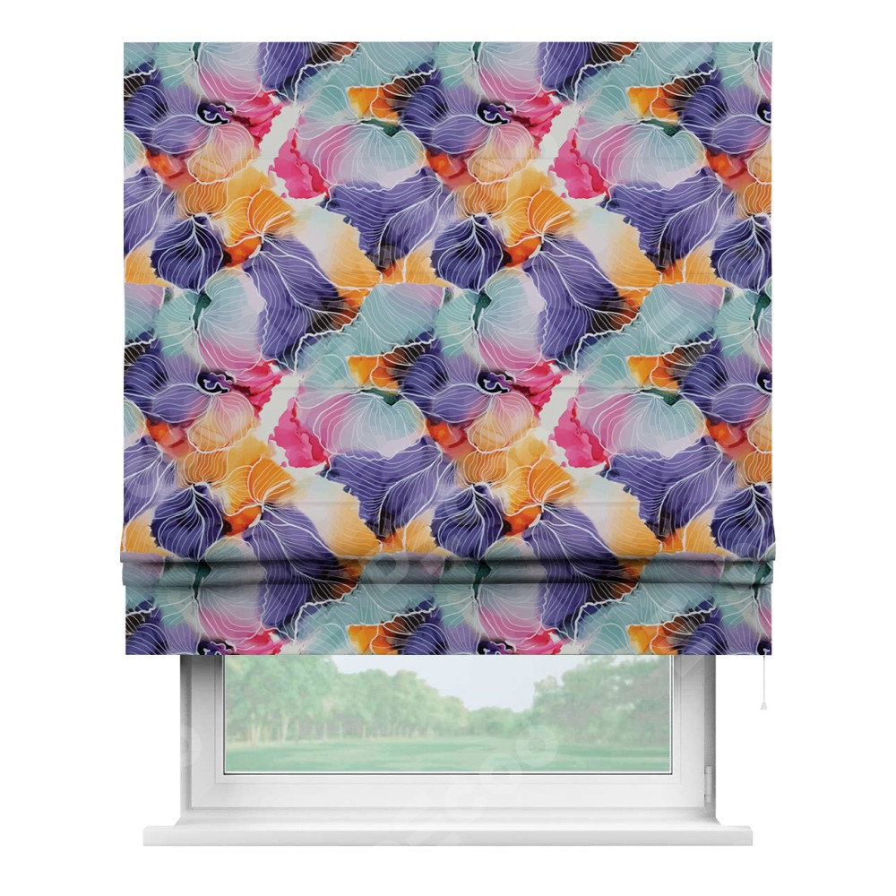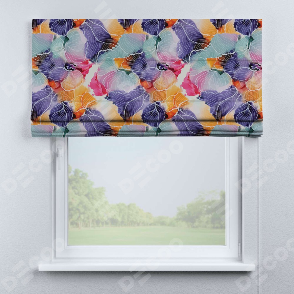 Римская штора производителя «Cortin», используется для проёма, пошита из ткани блэкаут с нанесением сублимационной печати «Роскошные ирисы». Имеет универсальный механизм и подходит для монтажа: на потолок, на стену и в нишу.