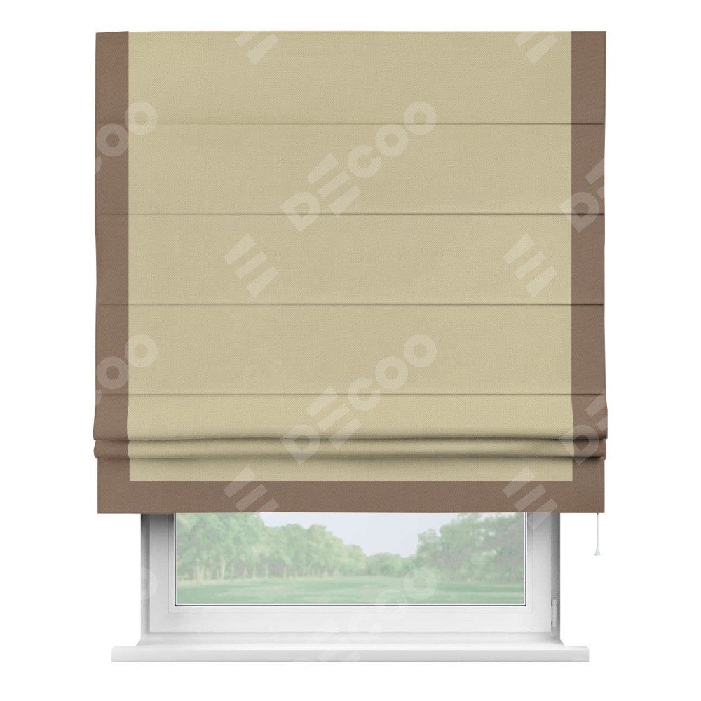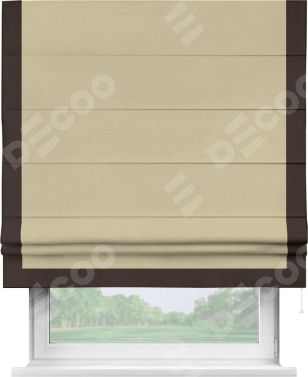 Римская штора производителя «Cortin», используется для проёма, пошита из ткани блэкаут однотонный кофейный, артикул ткани 13130. Отделка шторы кантом «Виктория», ткань для канта используется из блэкаута однотонного разной расцветки на выбор. Имеет универсальный механизм и подходит для монтажа: на потолок, на стену и в нишу.