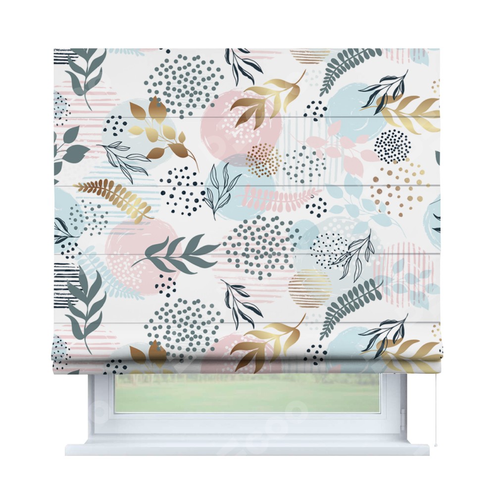 Римская штора производителя «Cortin», используется для проёма, пошита из ткани блэкаут с нанесением сублимационной печати «Точки и листочки». Имеет универсальный механизм и подходит для монтажа: на потолок, на стену и в нишу.