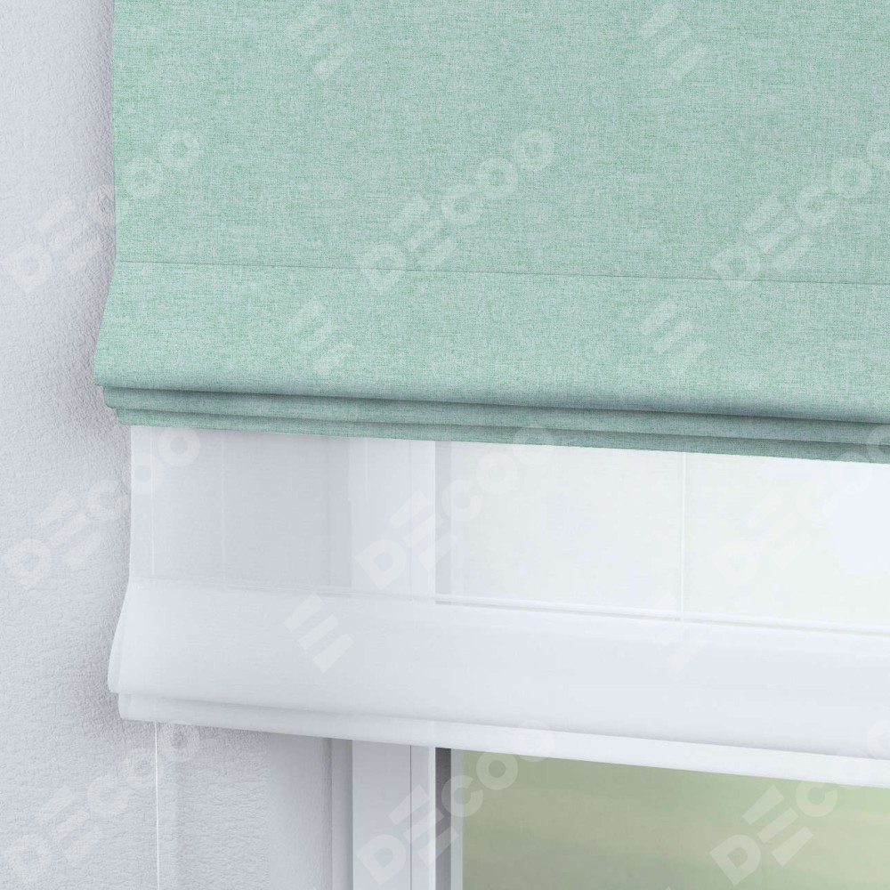 Римская штора день-ночь производителя «Cortin», используется для проёма, пошита из двух полотен, с лицевой стороны лён кашемир мятный артикул 21617, вторая ткань тюль (по стандарту комплектуется тюль белого цвета артикул V-01). Имеет универсальный механизм и подходит для монтажа: на потолок, на стену и в нишу.