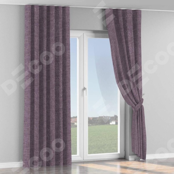 Комплект прямых штор, от производителя «Cortin», пошиты из ткани лён кашемир фиолетовый, артикул ткани 17211. С изнаночной стороны в верхней части штор пристрачивается шторная лента с декоративными складками «Волна». Для создания элегантных складок прямые шторы шьются по стандарту с коэффициентом 1:2 (на 100 см. ширины проёма 200 см. ширины ткани).