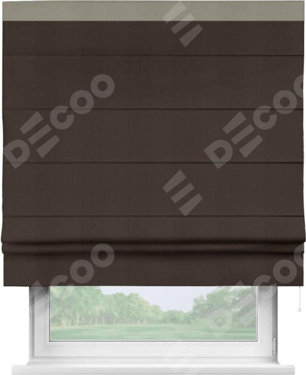 Римская штора производителя «Cortin», используется для проёма, пошита из ткани блэкаут однотонный тёмно-коричневый, артикул ткани 88287. Отделка шторы кантом «Кинг», ткань для канта используется из блэкаута однотонного разной расцветки на выбор. Имеет универсальный механизм и подходит для монтажа: на потолок, на стену и в нишу.