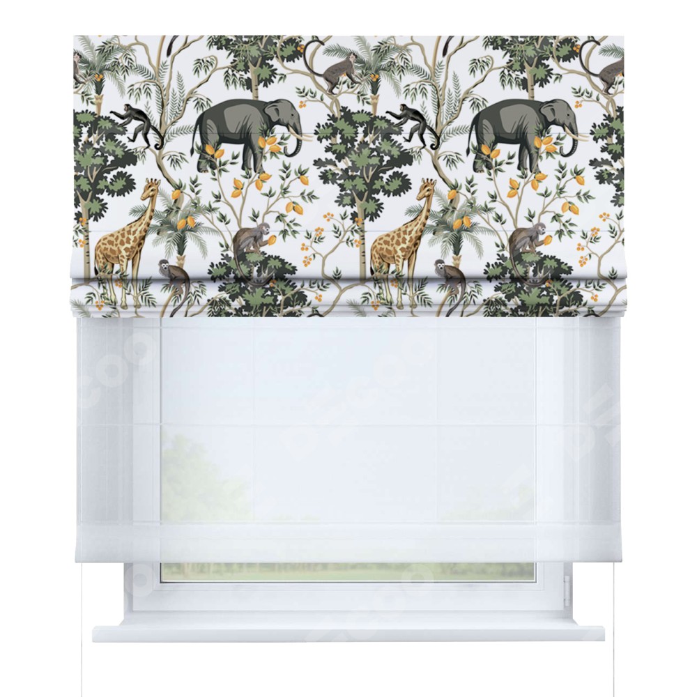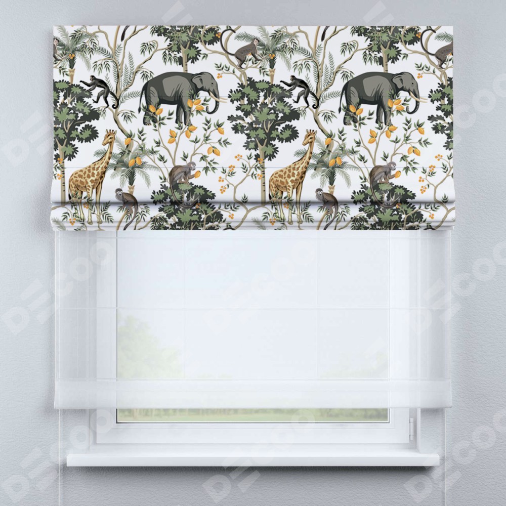 Римская штора день-ночь производителя «Cortin», используется для проёма, пошита из двух полотен, с лицевой блэкаут с нанесением сублимационной печати «Африканские равнины», вторая ткань тюль (по стандарту комплектуется тюль белого цвета артикул V-01). Имеет универсальный механизм и подходит для монтажа: на потолок, на стену и в нишу.