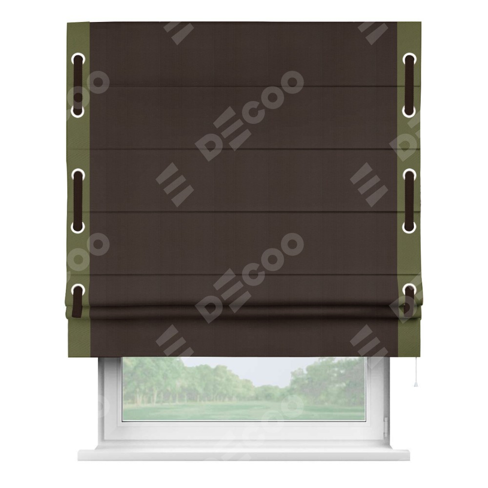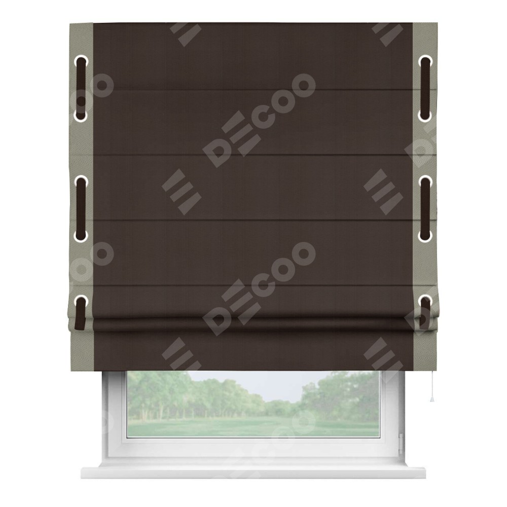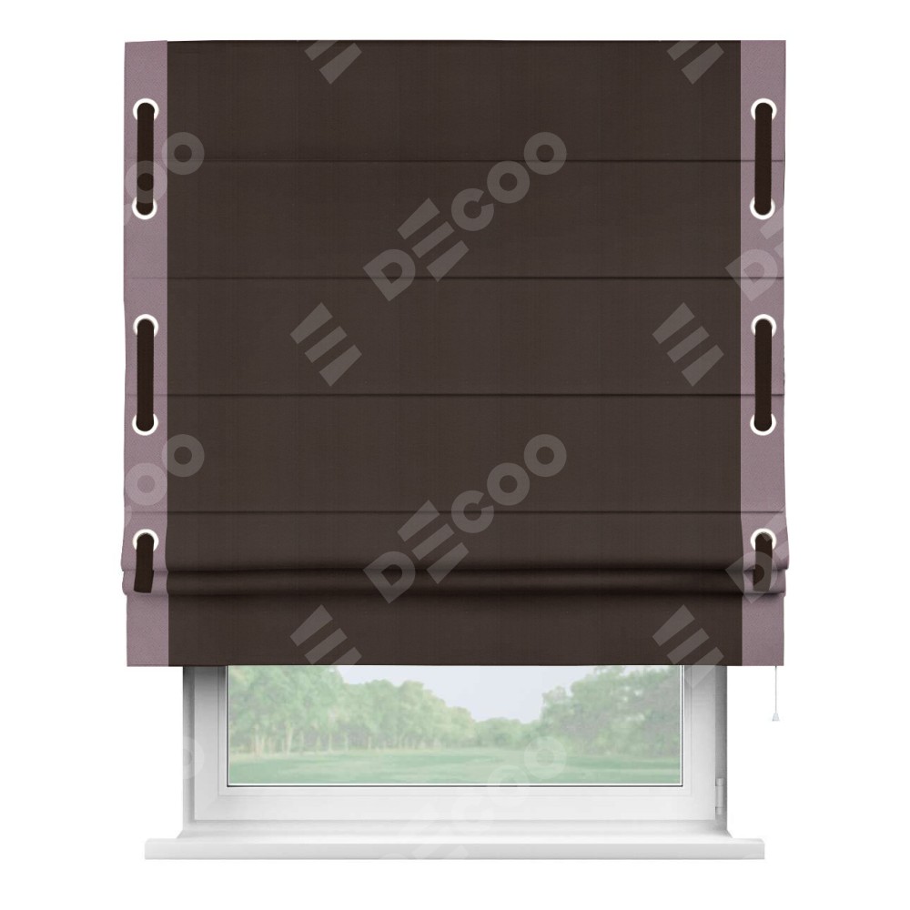 Римская штора производителя «Cortin», используется для проёма, пошита из ткани блэкаут однотонный тёмно-коричневый, артикул ткани 88287. Отделка шторы кантом «Стрим Дуо» на кантах расположены люверсы с пояском, ткань для канта используется из блэкаута однотонного разной расцветки на выбор. Ткань для пояска обычно используется из основной ткани шторы, а так же можно сделать из любой расцветки по желанию. Имеет универсальный механизм и подходит для монтажа: на потолок, на стену и в нишу.