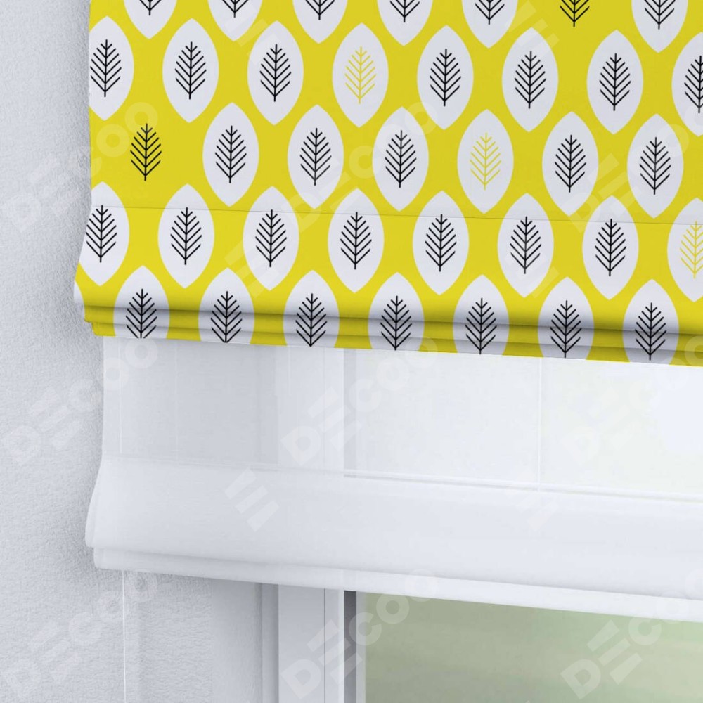 Римская штора день-ночь производителя «Cortin», используется для проёма, пошита из двух полотен, с лицевой блэкаут с нанесением сублимационной печати «Солнечные листья», вторая ткань тюль (по стандарту комплектуется тюль белого цвета артикул V-01). Имеет универсальный механизм и подходит для монтажа: на потолок, на стену и в нишу.