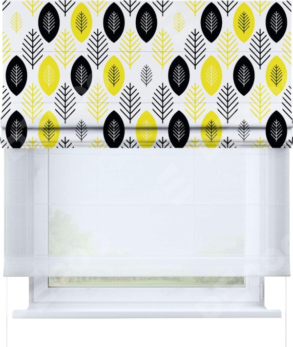 Римская штора день-ночь производителя «Cortin», используется для проёма, пошита из двух полотен, с лицевой блэкаут с нанесением сублимационной печати «Черно-желтый модерн», вторая ткань тюль (по стандарту комплектуется тюль белого цвета артикул V-01). Имеет универсальный механизм и подходит для монтажа: на потолок, на стену и в нишу.