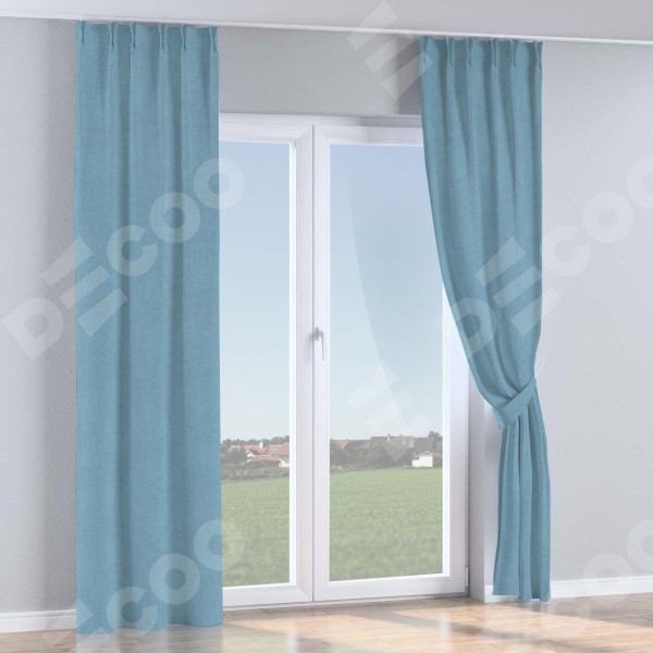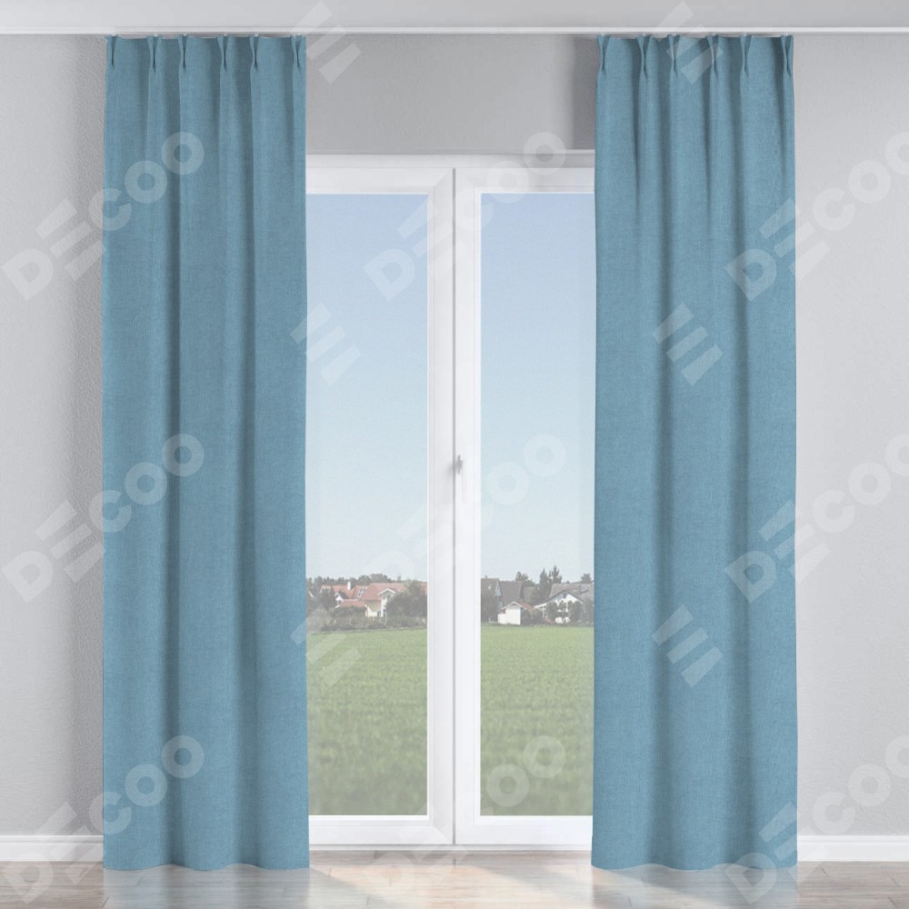 Комплект прямых штор, от производителя «Cortin», пошиты из ткани лён блэкаут голубой, артикул ткани 69574. С изнаночной стороны в верхней части штор пристрачивается шторная лента с декоративными складками «Кустик». Для создания элегантных складок прямые шторы шьются по стандарту с коэффициентом 1:2 (на 100 см. ширины проёма 200 см. ширины ткани).