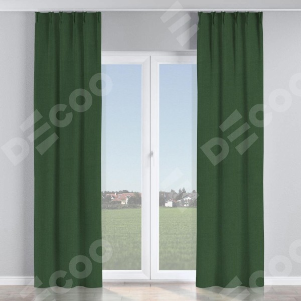 Комплект прямых штор, от производителя «Cortin», пошиты из ткани лён блэкаут зелёный, артикул ткани 69497. С изнаночной стороны в верхней части штор пристрачивается шторная лента с декоративными складками «Кустик». Для создания элегантных складок прямые шторы шьются по стандарту с коэффициентом 1:2 (на 100 см. ширины проёма 200 см. ширины ткани).