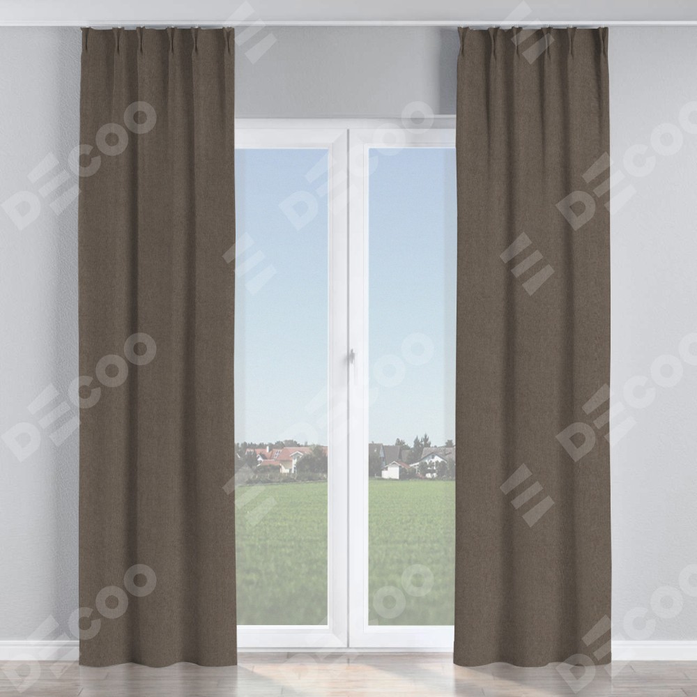 Комплект прямых штор, от производителя «Cortin», пошиты из ткани лён блэкаут коричневый, артикул ткани 69383. С изнаночной стороны в верхней части штор пристрачивается шторная лента с декоративными складками «Кустик». Для создания элегантных складок прямые шторы шьются по стандарту с коэффициентом 1:2 (на 100 см. ширины проёма 200 см. ширины ткани).