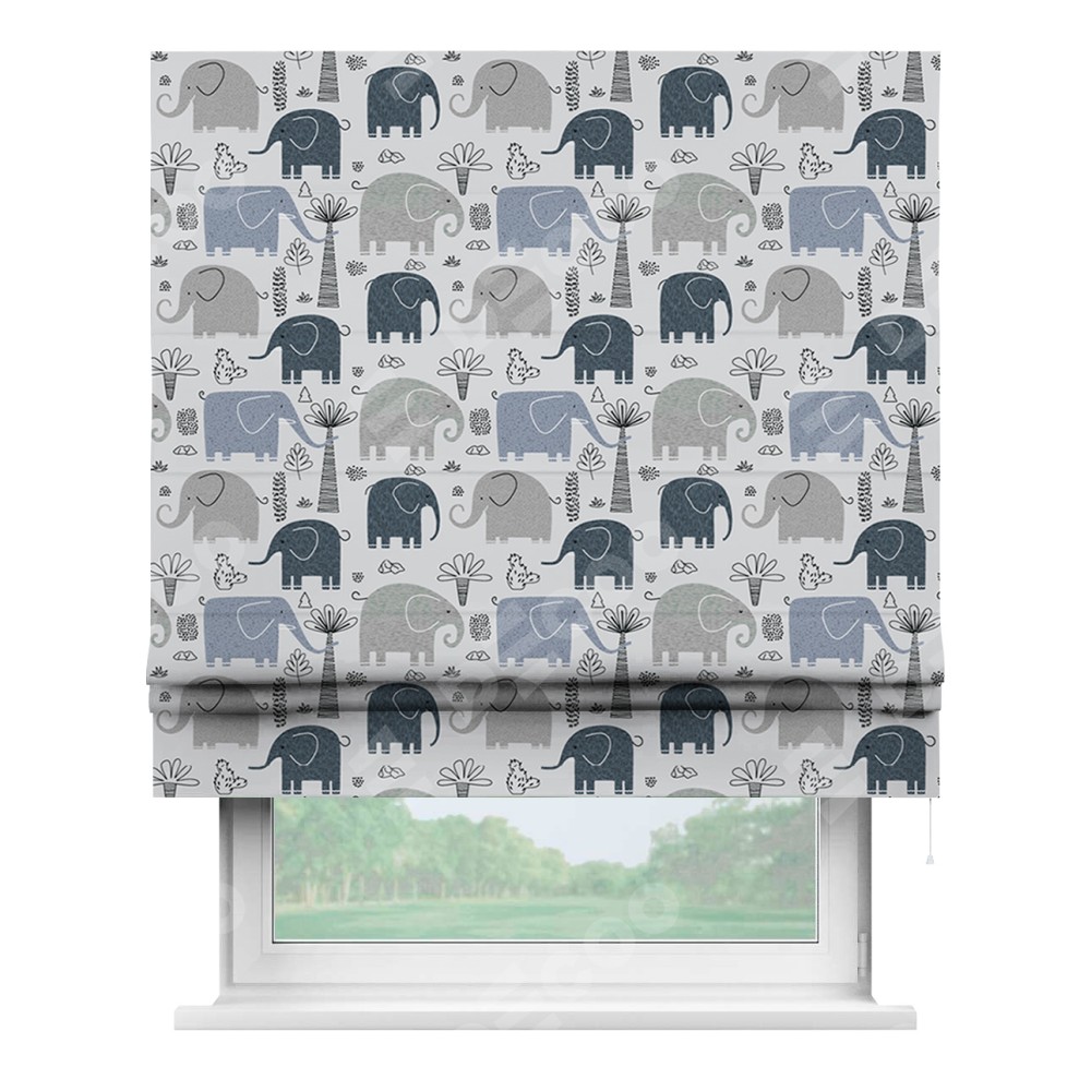 Римская штора производителя «Cortin», используется для проёма, пошита из ткани блэкаут с нанесением сублимационной печати «Серые слоники». Имеет универсальный механизм и подходит для монтажа: на потолок, на стену и в нишу.