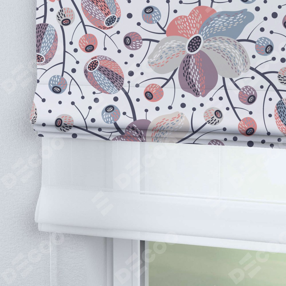 Римская штора день-ночь производителя «Cortin», используется для проёма, пошита из двух полотен, с лицевой блэкаут с нанесением сублимационной печати «Цветочный микс», вторая ткань тюль (по стандарту комплектуется тюль белого цвета артикул V-01). Имеет универсальный механизм и подходит для монтажа: на потолок, на стену и в нишу.