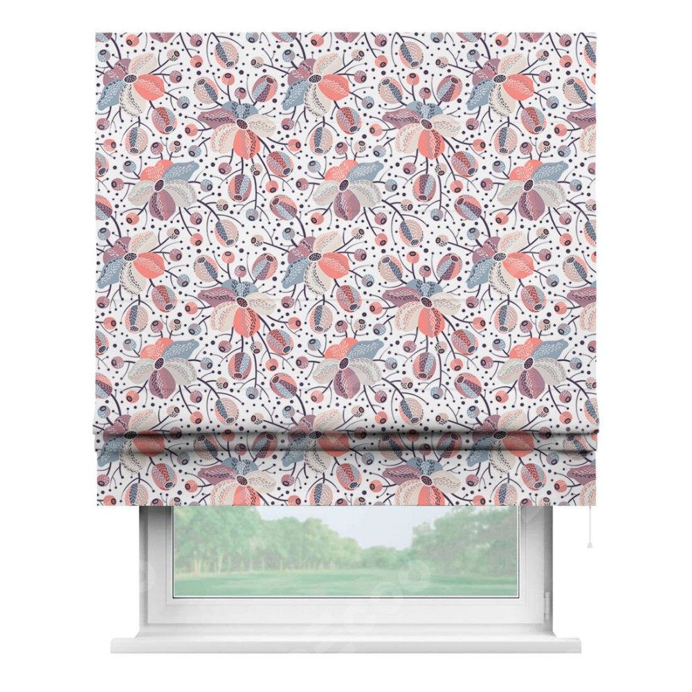 Римская штора производителя «Cortin», используется для проёма, пошита из ткани блэкаут с нанесением сублимационной печати «Цветочный микс». Имеет универсальный механизм и подходит для монтажа: на потолок, на стену и в нишу.