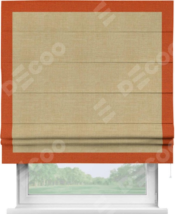 Римская штора производителя «Cortin», используется для проёма, пошита из ткани лён бежевый, артикул 7442. Отделка шторы кантом «Чесс», ткань для канта используется из льна разной расцветки на выбор. Имеет универсальный механизм и подходит для монтажа: на потолок, на стену и в нишу.