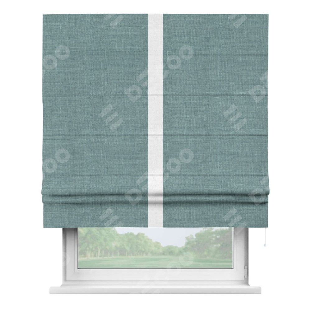 Римская штора производителя «Cortin», используется для проёма, пошита из ткани лён голубой, артикул 74736. Отделка шторы кантом «Хайвэй», ткань для канта используется из льна разной расцветки на выбор. Имеет универсальный механизм и подходит для монтажа: на потолок, на стену и в нишу.