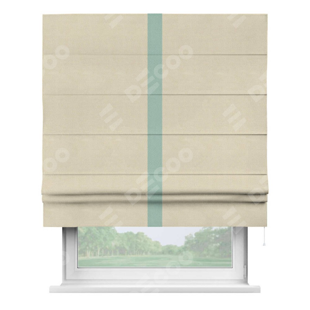 Римская штора производителя «Cortin», используется для проёма, пошита из ткани блэкаут однотонный бежевый, артикул ткани 13125. Отделка шторы кантом «Хайвей», ткань для канта используется из блэкаута однотонного разной расцветки на выбор. Имеет универсальный механизм и подходит для монтажа: на потолок, на стену и в нишу.