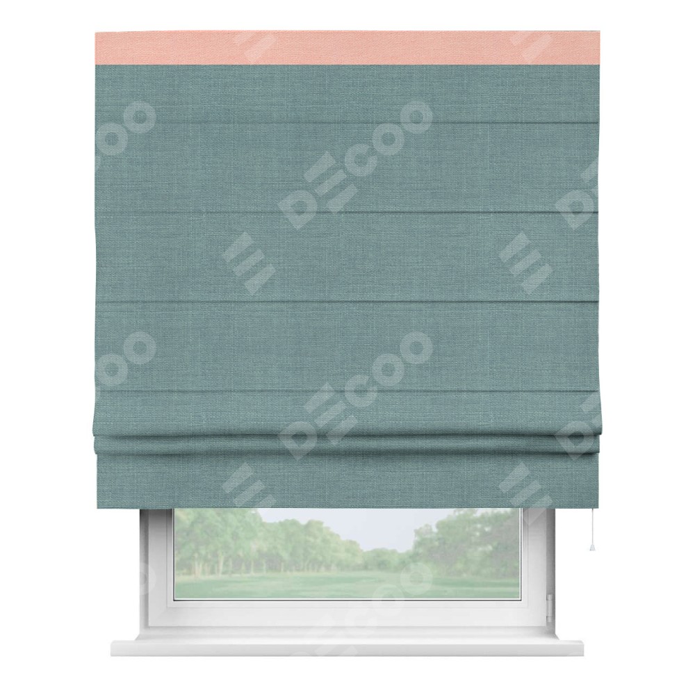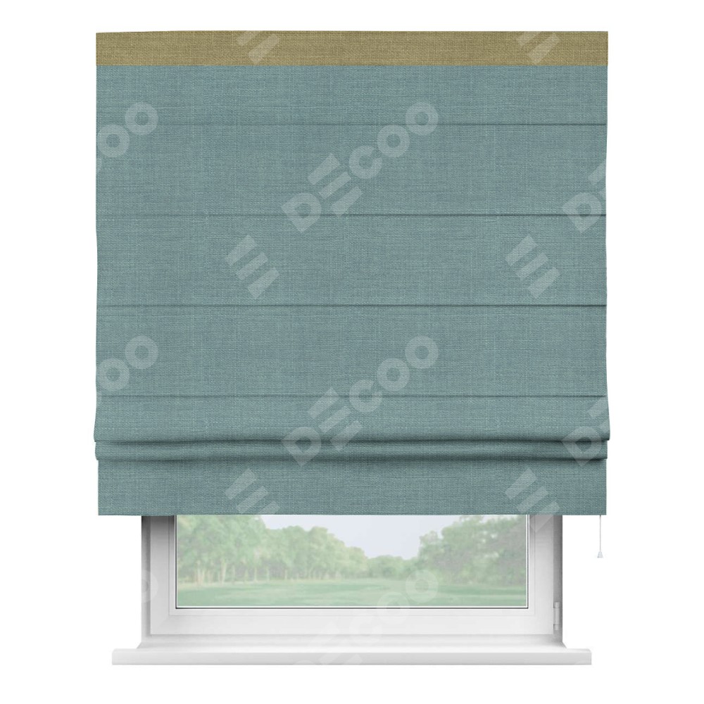 Римская штора производителя «Cortin», используется для проёма, пошита из ткани лён голубой, артикул 74 736. Отделка шторы кантом «Кинг», ткань для канта используется из льна разной расцветки на выбор. Имеет универсальный механизм и подходит для монтажа: на потолок, на стену и в нишу.