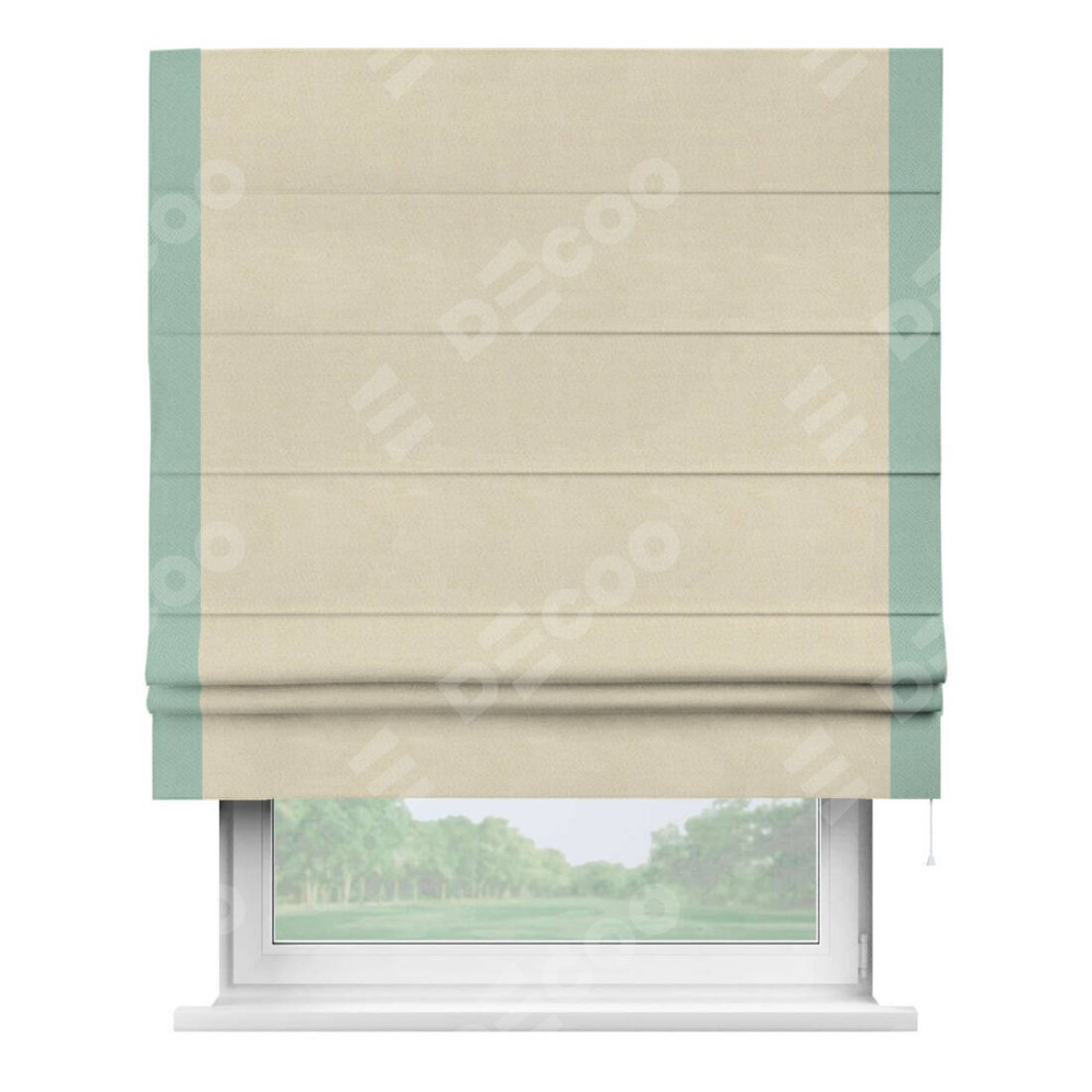 Римская штора производителя «Cortin», используется для проёма, пошита из ткани блэкаут однотонный бежевый, артикул ткани 13125. Отделка шторы кантом «Стрим Дуо», ткань для канта используется из блэкаута однотонного разной расцветки на выбор. Имеет универсальный механизм и подходит для монтажа: на потолок, на стену и в нишу.