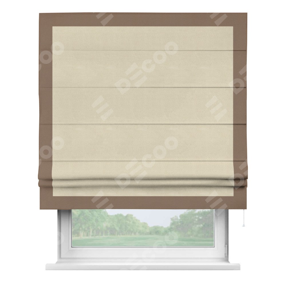 Римская штора производителя «Cortin», используется для проёма, пошита из ткани блэкаут однотонный бежевый, артикул ткани 13125. Отделка шторы кантом «Чесс», ткань для канта используется из блэкаута однотонного разной расцветки на выбор. Имеет универсальный механизм и подходит для монтажа: на потолок, на стену и в нишу.