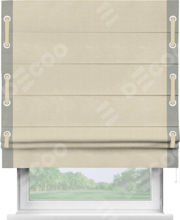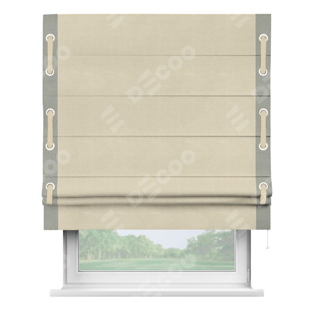 Римская штора производителя «Cortin», используется для проёма, пошита из ткани блэкаут однотонный бежевый, артикул ткани 13125. Отделка шторы кантом «Стрим Дуо» на кантах расположены люверсы с пояском, ткань для канта используется из блэкаута однотонного разной расцветки на выбор. Ткань для пояска обычно используется из основной ткани шторы, а так же можно сделать из любой расцветки по желанию. Имеет универсальный механизм и подходит для монтажа: на потолок, на стену и в нишу.