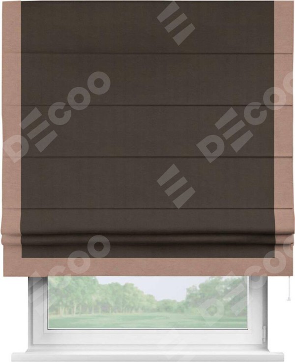 Римская штора производителя «Cortin», используется для проёма, пошита из ткани вельвет тёмно-коричневый, артикул ткани 30991. Отделка шторы кантом «Виктория», ткань для канта используется из вельвета разной расцветки на выбор. Имеет универсальный механизм и подходит для монтажа: на потолок, на стену и в нишу.