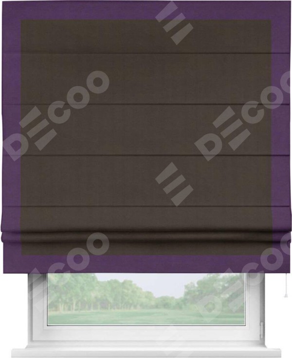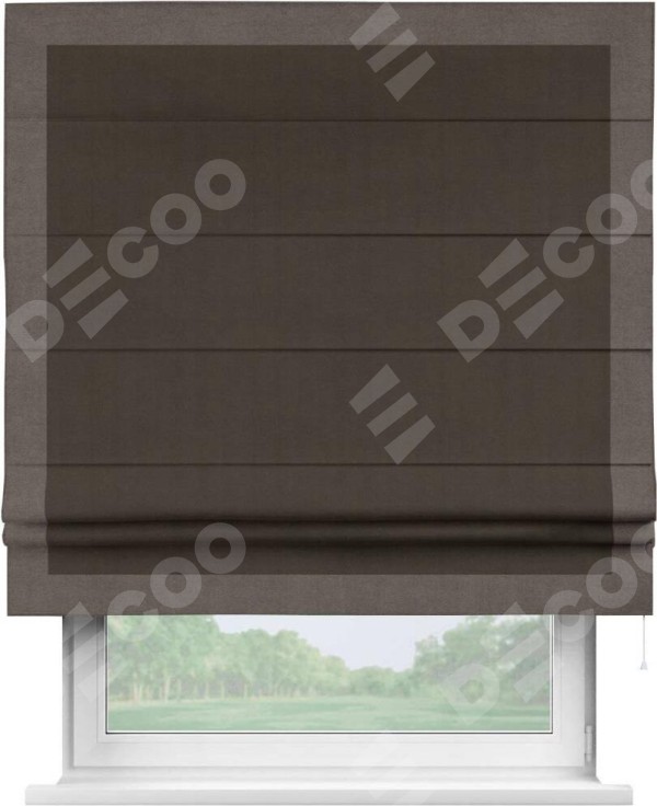 Римская штора производителя «Cortin», используется для проёма, пошита из ткани вельвет тёмно-коричневый, артикул ткани 30991. Отделка шторы кантом «Чесс», ткань для канта используется из вельвета разной расцветки на выбор. Имеет универсальный механизм и подходит для монтажа: на потолок, на стену и в нишу.
