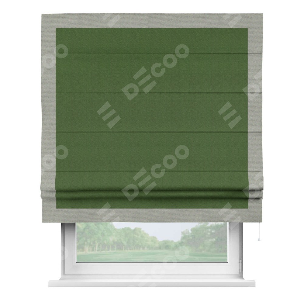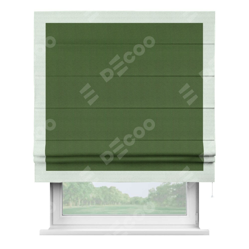Римская штора производителя «Cortin», используется для проёма, пошита из ткани блэкаут однотонный зелёный перламутр, артикул ткани 81859−2. Отделка шторы кантом «Чесс», ткань для канта используется из блэкаута однотонного разной расцветки на выбор. Имеет универсальный механизм и подходит для монтажа: на потолок, на стену и в нишу.