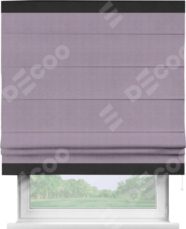 Римская штора производителя «Cortin», используется для проёма, пошита из ткани блэкаут однотонный светло-сиреневый, артикул ткани 29333−1. Отделка шторы кантом «Горизонт», ткань для канта используется из блэкаута однотонного разной расцветки на выбор. Имеет универсальный механизм и подходит для монтажа: на потолок, на стену и в нишу.