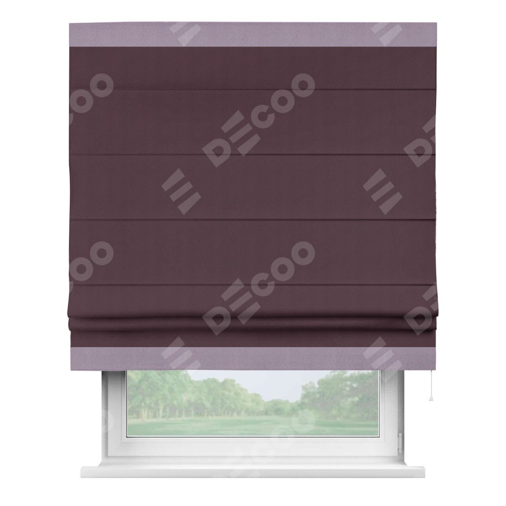 Римская штора производителя «Cortin», используется для проёма, пошита из ткани блэкаут однотонный сиреневый, артикул ткани 29333−2. Отделка шторы кантом «Горизонт», ткань для канта используется из блэкаута однотонного разной расцветки на выбор. Имеет универсальный механизм и подходит для монтажа: на потолок, на стену и в нишу.