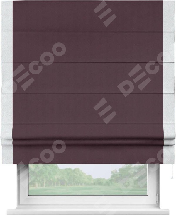 Римская штора производителя «Cortin», используется для проёма, пошита из ткани блэкаут однотонный сиреневый, артикул ткани 29333−2. Отделка шторы кантом «Стрим Дуо», ткань для канта используется из блэкаута однотонного разной расцветки на выбор. Имеет универсальный механизм и подходит для монтажа: на потолок, на стену и в нишу.