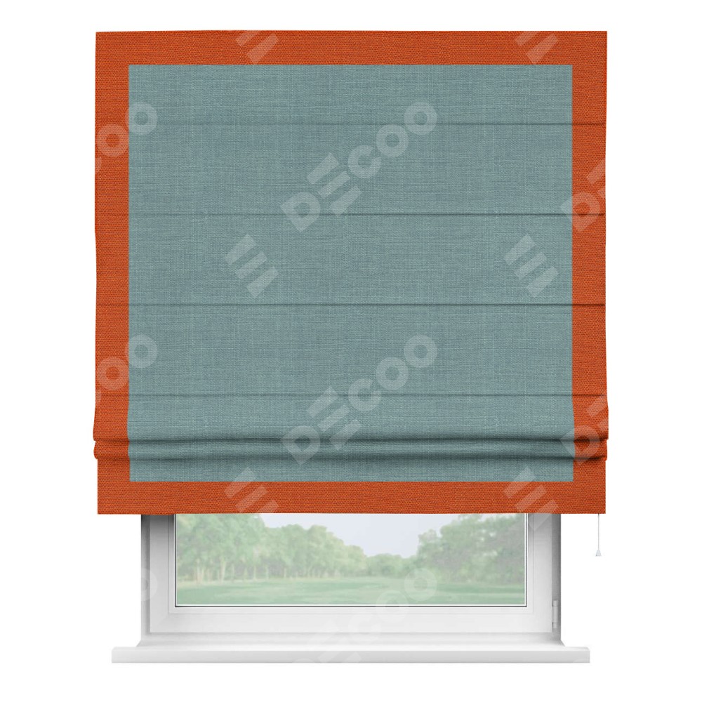 Римская штора производителя «Cortin», используется для проёма, пошита из ткани лён голубой, артикул 74736. Отделка шторы кантом «Чесс», ткань для канта используется из льна разной расцветки на выбор. Имеет универсальный механизм и подходит для монтажа: на потолок, на стену и в нишу.