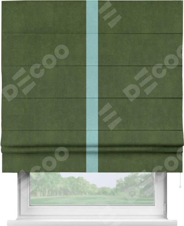 Римская штора производителя «Cortin», используется для проёма, пошита из ткани вельвет тёмно-салатовый, артикул ткани 33805. Отделка шторы кантом «Хайвей», ткань для канта используется из вельвета разной расцветки на выбор. Имеет универсальный механизм и подходит для монтажа: на потолок, на стену и в нишу.