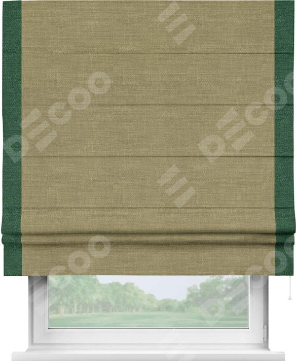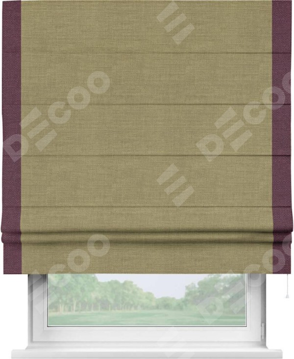 Римская штора производителя «Cortin», используется для проёма, пошита из ткани лён коричневый, артикул 7443. Отделка шторы кантом «Стрим Дуо», ткань для канта используется из льна разной расцветки на выбор. Имеет универсальный механизм и подходит для монтажа: на потолок, на стену и в нишу.