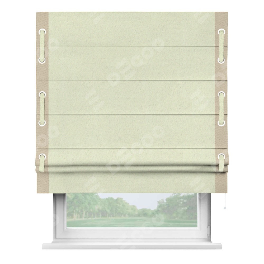 Римская штора производителя «Cortin», используется для проёма, пошита из ткани блэкаут однотонный сливочный, артикул ткани 6668−02. Отделка шторы кантом «Стрим Дуо» на кантах расположены люверсы с пояском, ткань для канта используется из блэкаута однотонного разной расцветки на выбор. Ткань для пояска обычно используется из основной ткани шторы, а так же можно сделать из любой расцветки по желанию. Имеет универсальный механизм и подходит для монтажа: на потолок, на стену и в нишу.