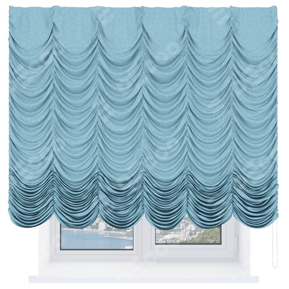 Французская штора производителя «Cortin», используется для проёма, пошита из ткани лён кашемир голубой, артикул ткани 21616. Имеет универсальный механизм и подходит для монтажа: на потолок и на стену.