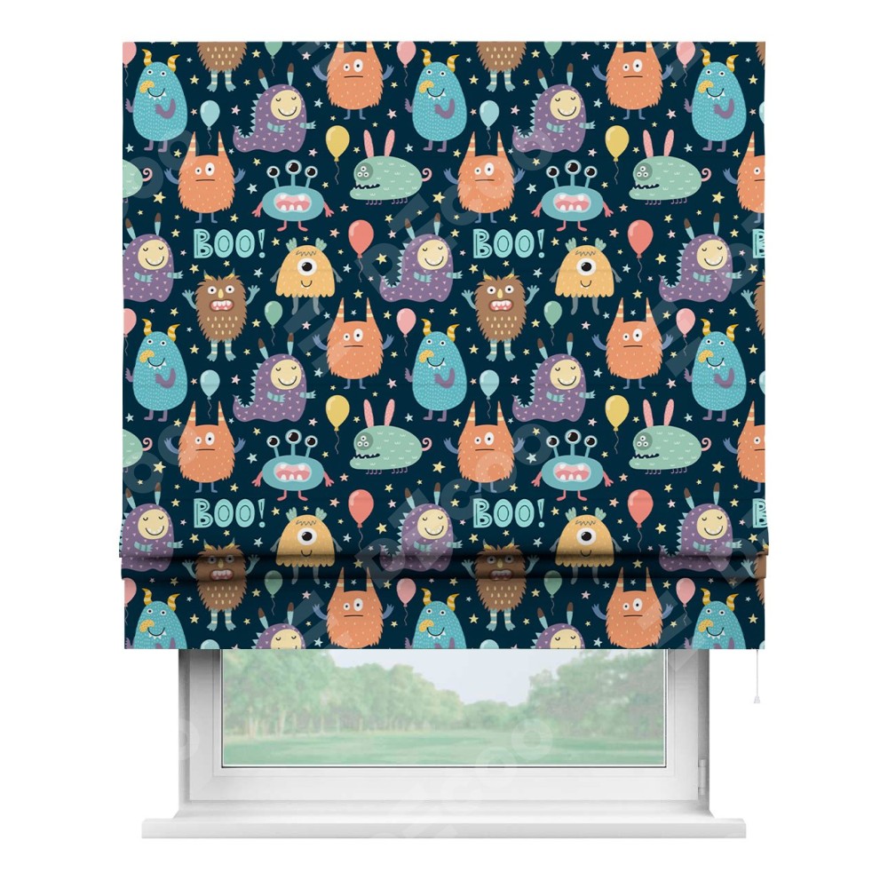 Римская штора производителя «Cortin», используется для проёма, пошита из ткани блэкаут с нанесением сублимационной печати «Звёздные страшилки». Имеет универсальный механизм и подходит для монтажа: на потолок, на стену и в нишу.