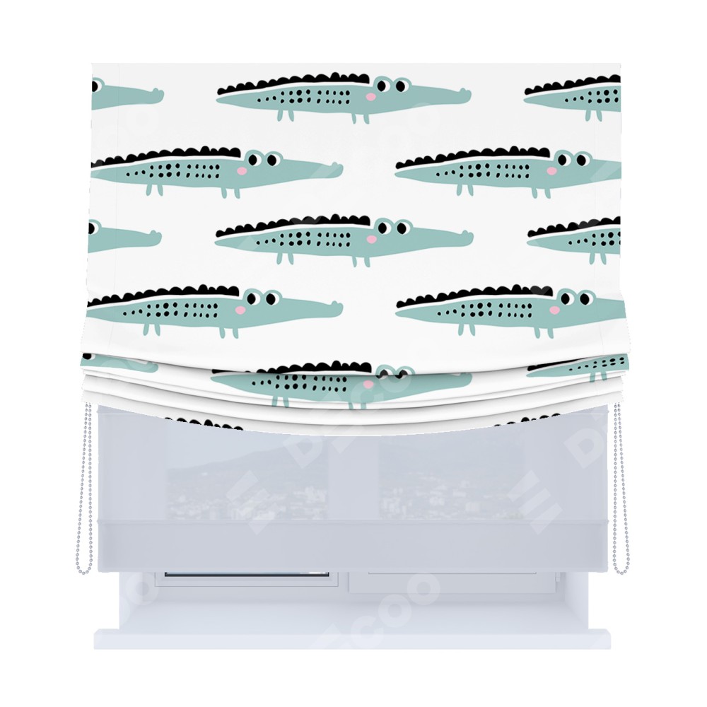 Римская штора день-ночь производителя «Cortin», используется для проёма, пошита из двух полотен, с лицевой блэкаут с нанесением сублимационной печати «Мистер Крок», вторая ткань тюль (по стандарту комплектуется тюль белого цвета артикул V-01). Имеет универсальный механизм и подходит для монтажа: на потолок, на стену и в нишу. Удобное управление каждой шторой отдельно.