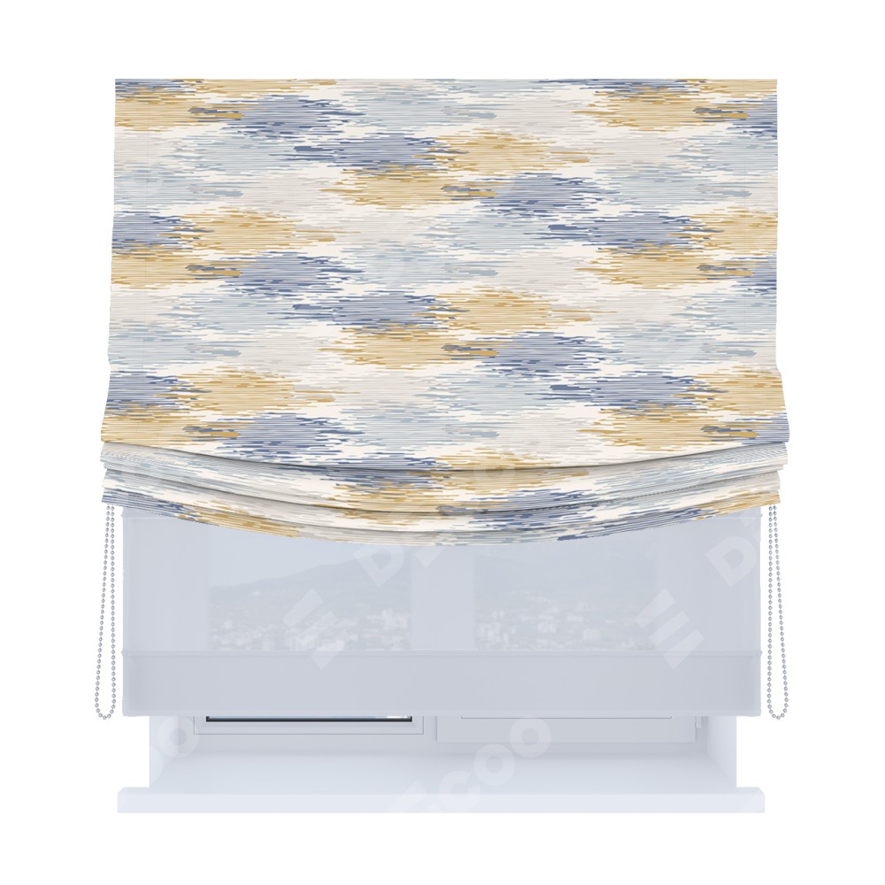 Римская штора день-ночь производителя «Cortin», используется для проёма, пошита из двух полотен, с лицевой блэкаут с нанесением сублимационной печати «Полосатая волна», вторая ткань тюль (по стандарту комплектуется тюль белого цвета артикул V-01). Имеет универсальный механизм и подходит для монтажа: на потолок, на стену и в нишу. Удобное управление каждой шторой отдельно.