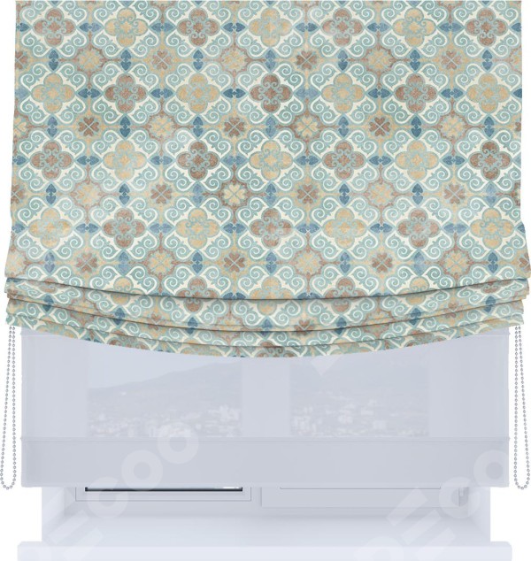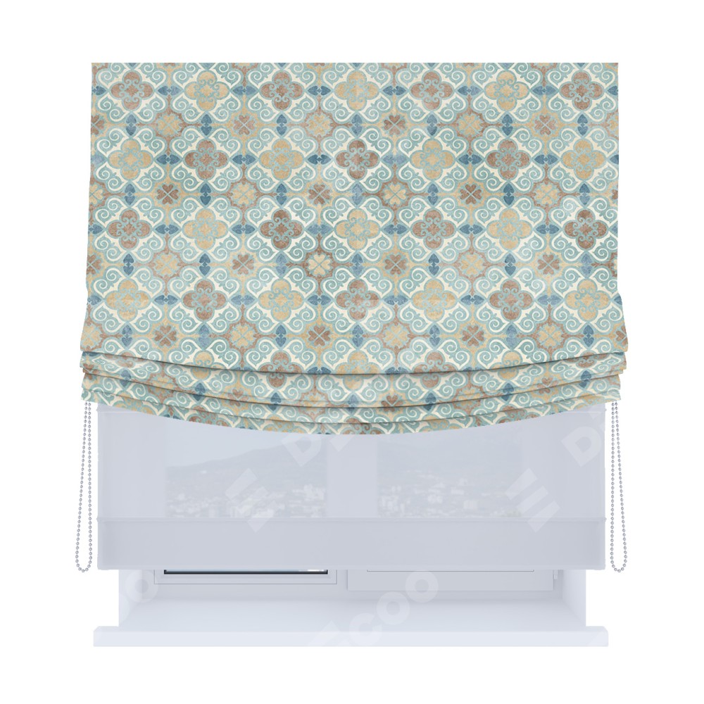 Римская штора день-ночь производителя «Cortin», используется для проёма, пошита из двух полотен, с лицевой блэкаут с нанесением сублимационной печати «Фарида», вторая ткань тюль (по стандарту комплектуется тюль белого цвета артикул V-01). Имеет универсальный механизм и подходит для монтажа: на потолок, на стену и в нишу. Удобное управление каждой шторой отдельно.