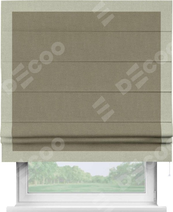 Римская штора производителя «Cortin», используется для проёма, пошита из ткани лён блэкаут бежевый, артикул 69435. Отделка шторы кантом «Чесс», ткань для канта используется из льна разной расцветки на выбор. Имеет универсальный механизм и подходит для монтажа: на потолок, на стену и в нишу.