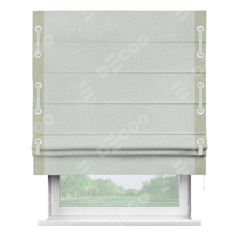 Римская штора производителя «Cortin», используется для проёма, пошита из ткани лён блэкаут белый, артикул 69451. Отделка шторы кантом «Стрим Дуо» на кантах расположены люверсы с пояском, ткань для канта используется из льна разной расцветки на выбор. Ткань для пояска обычно используется из основной ткани шторы, а так же можно сделать из любой расцветки по желанию. Имеет универсальный механизм и подходит для монтажа: на потолок, на стену и в нишу.