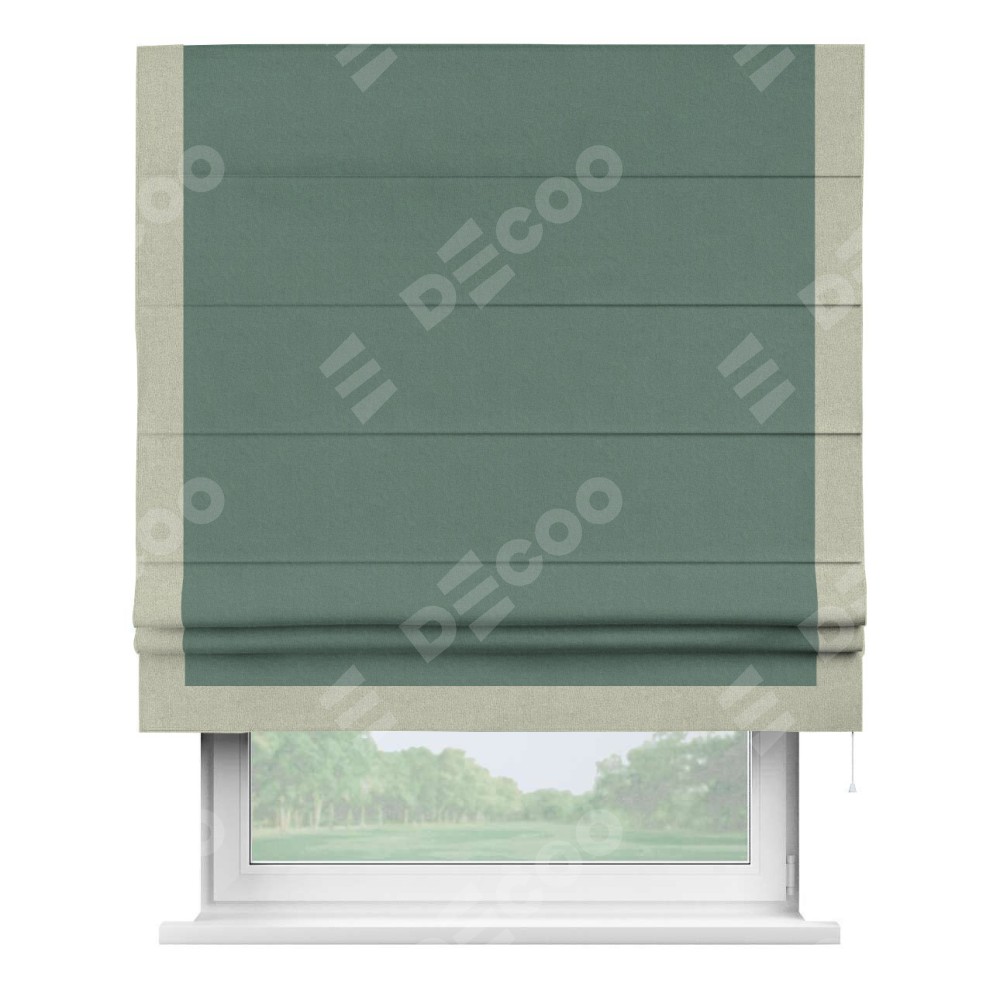 Римская штора производителя «Cortin», используется для проёма, пошита из ткани лён блэкаут бирюзовый, артикул 69517. Отделка шторы кантом «Виктория», ткань для канта используется из льна разной расцветки на выбор. Имеет универсальный механизм и подходит для монтажа: на потолок, на стену и в нишу.